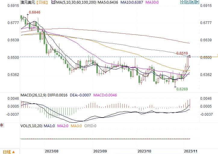 上周五(11月3日),美国非农数据低于预期引动非美货币集体上升,澳元/美元不遑多让,当日劲升1.2%,高收盘于0.6512。美国非农以及失业率数据的欠佳,更大程度地提升了市场对于美元利率见顶的预期。美国指标性十年国债收益率已低落至4.48%水平,澳洲债券收益率水平则有望与之持平甚至能出超。而对于澳联储的动向,路透调查显示,近90%分析师预计,澳洲央行将于11月7日政策会议上将利率调升25个基点至4.35%。目前澳元正基于这种此升彼降的预期而获得了上冲的动能。当然了,我们还是要警惕,若本周二澳联储也一如其他欧美央行一般维持当前联邦基准利率不变,且会后发表声言鹰派不足,澳元/美元的反弹则很有可能遭遇一定的阻碍。仅从技术上来看,日线图的布林带喇叭口在扩张,MACD、RIS等技术指标开始越过中轴线向上延摆,显示澳元反弹力度逐步增强。短线即便或因为澳联储如其他主要央行那般维持利率不动对澳元造成一定的不利,料也不至于将好不容易积累起来的澳元多头氛围打散。澳元/美元有望进入小调后延续反弹上涨的交易节奏。
