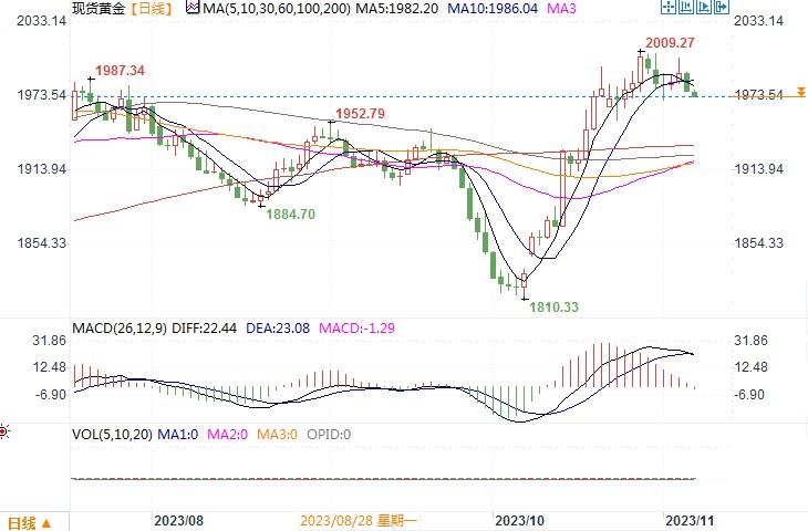 汇通财经APP讯——周一(11月6日),由于全球风险偏好情绪变得积极,金价受压出现滑落行情,日内跌0.73%,收盘于1977.53美元/盎司水平,盘中最低至1976.90美元/盎司。