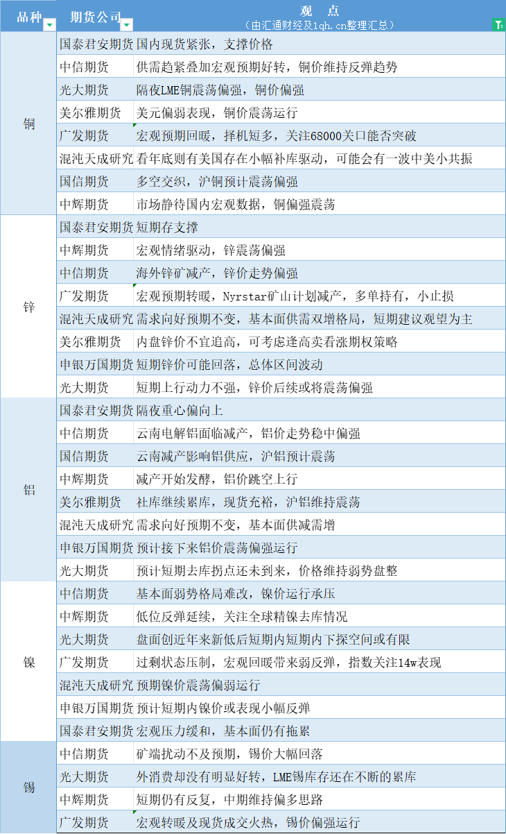 汇通财经APP讯——期货公司观点汇总一张图:11月7日有色系(铜、锌、铝、镍、锡等)