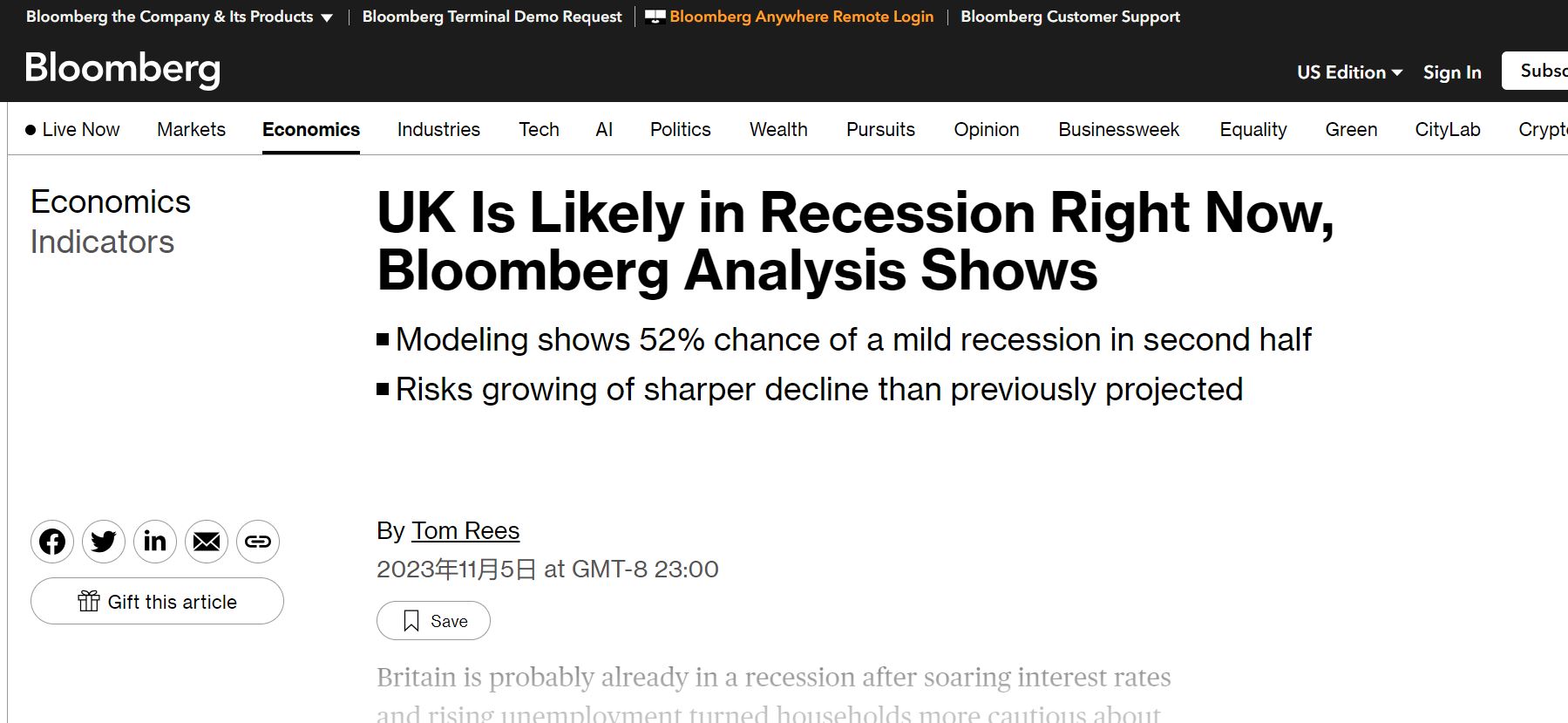 根据彭博经济研究公司的分析,由于利率飙升和失业率上升使家庭对支出更加谨慎,英国可能已经陷入衰退。