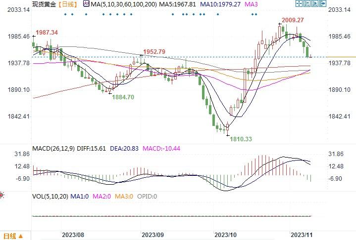 汇通财经APP讯——周三(11月8日),金价连续第三个交易日回落,日内下跌逾1%,低收盘在1949.79美元/盎司,创下自10月2日以来的最大单日跌幅。