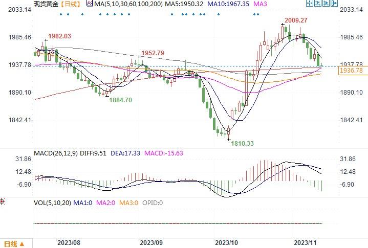 不过,周一(11月13日)亚洲交易时段,12月黄金期货延续跌势,目前交投于1938.5美元/盎司附近,已经初步跌破了200日均线1947.80关键位置。