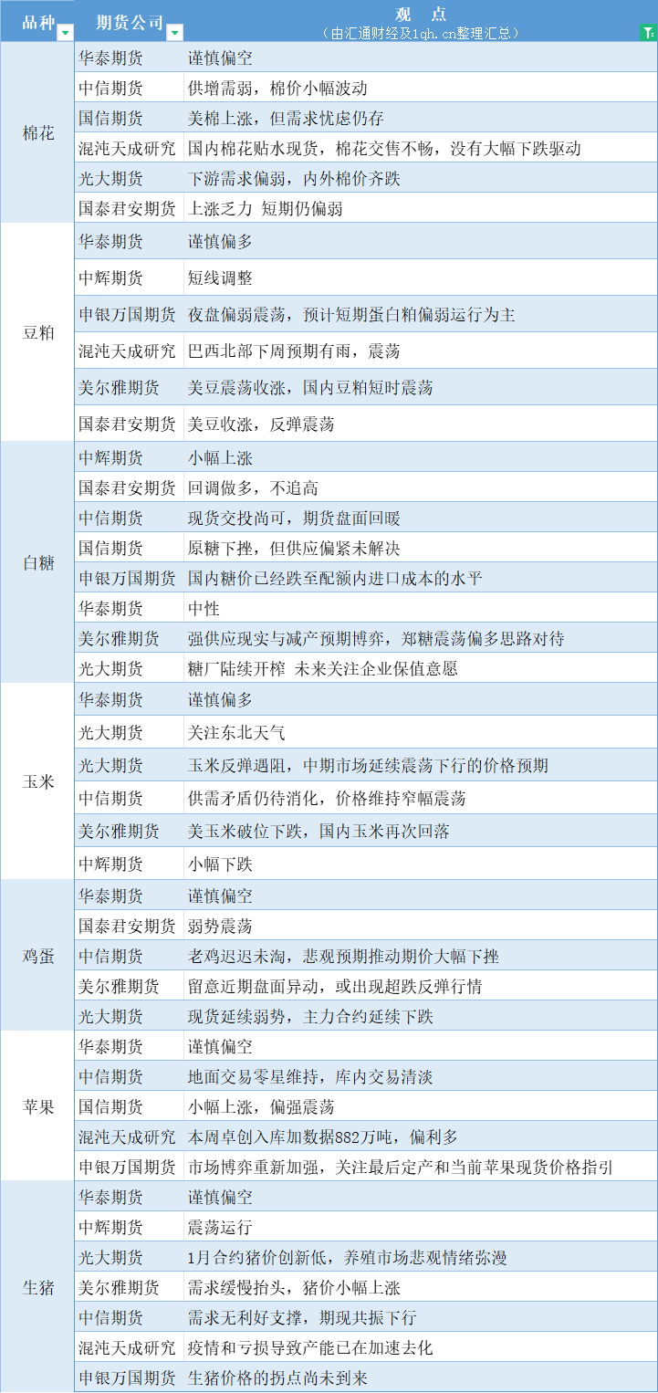 汇通财经APP讯——期货公司观点汇总一张图:11月13日农产品(棉花、豆粕、白糖、玉米、鸡蛋、生猪等)
