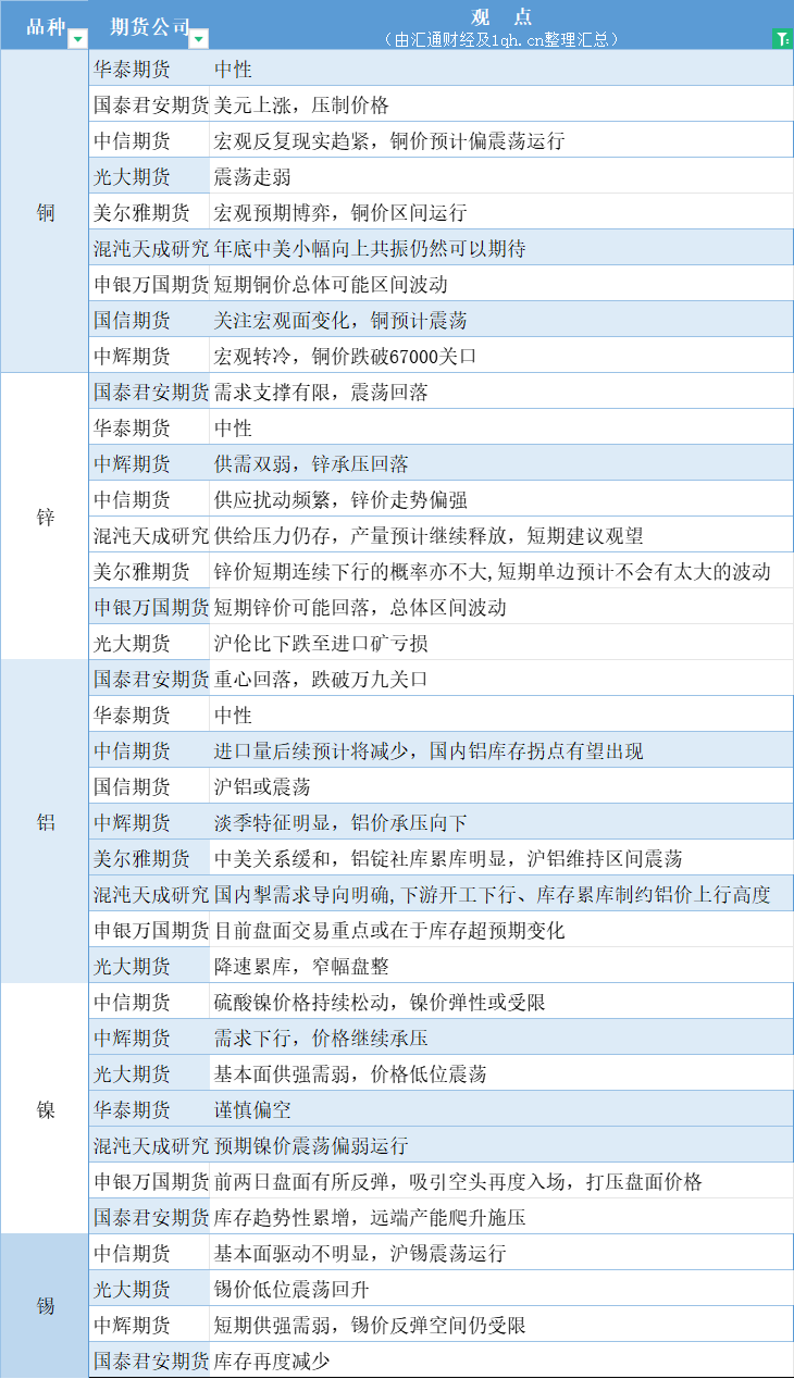 汇通财经APP讯——期货公司观点汇总一张图:11月13日有色系(铜、锌、铝、镍、锡等)