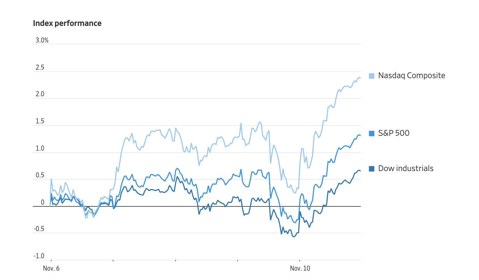 道琼斯工业平均指数上升 391 点或 1.2%;纳斯达克综合指数上升341.22点或 2.6%。使 11 月有望成为今年最好的月份之一。