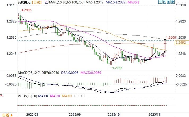 汇通财经APP讯——英镑兑美元周二(11月14日)升至1.25上方的两个月高位,此前美国公布10月通胀数据,显示美国通胀已放缓,程度超过市场预期。周三亚市,英镑兑美元守住隔夜大部分涨幅,目前交投于1.2492附近。