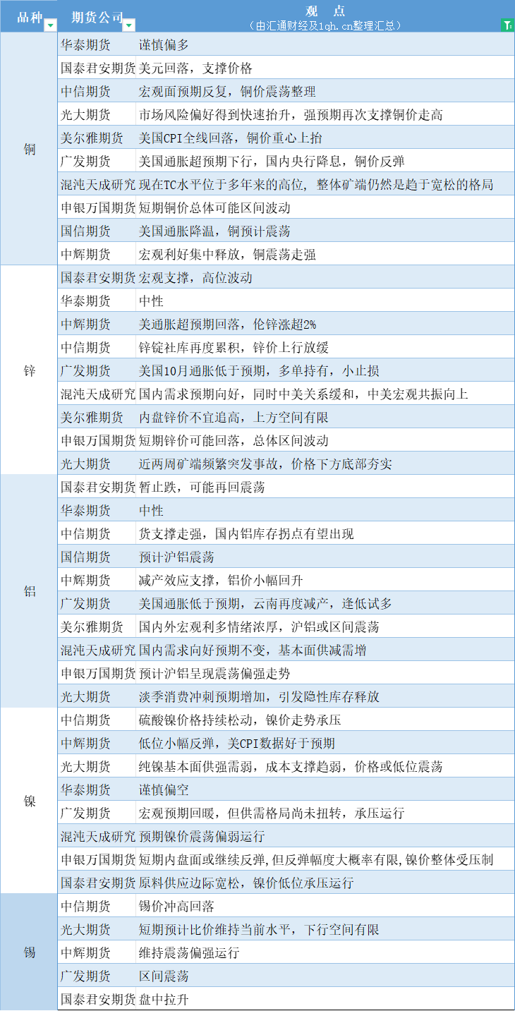 汇通财经APP讯——期货公司观点汇总一张图:11月15日有色系(铜、锌、铝、镍、锡等)