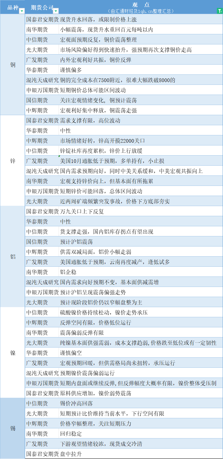 汇通财经APP讯——期货公司观点汇总一张图:11月16日有色系(铜、锌、铝、镍、锡等)