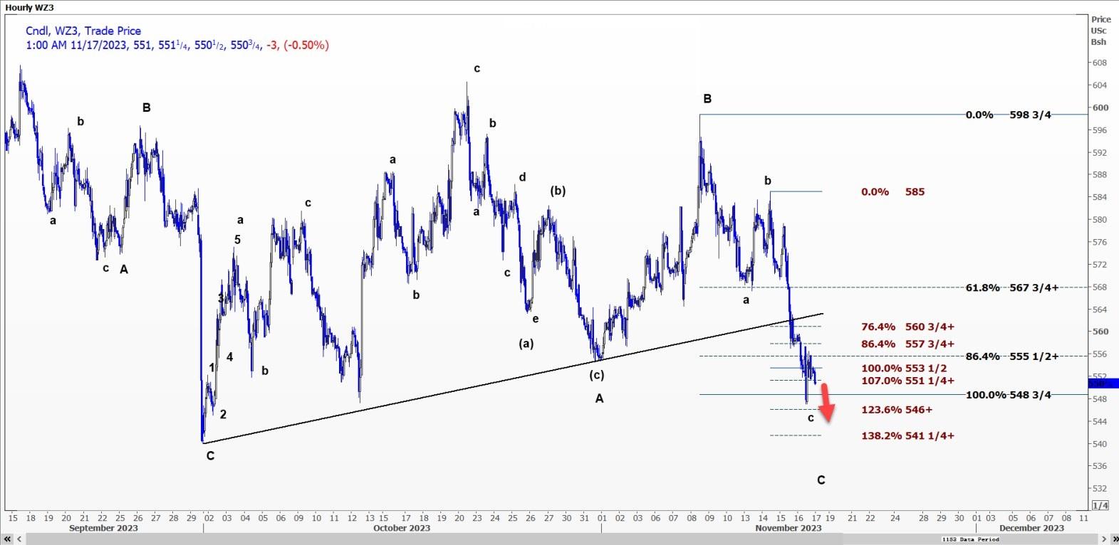 CBOT 12月小麦WZ3可能会重新测试每蒲式耳548.75美分的支撑位,跌破该支撑位可能会打开通往541.25美分至546美分区间的道路。