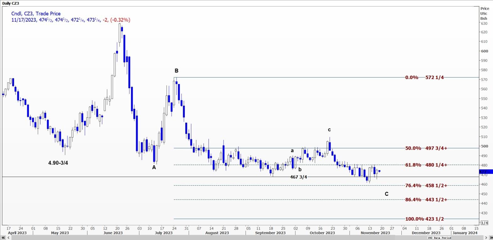 当合约脱离467.75美分至480.25美分的范围时,趋势信号将变得更加清晰。