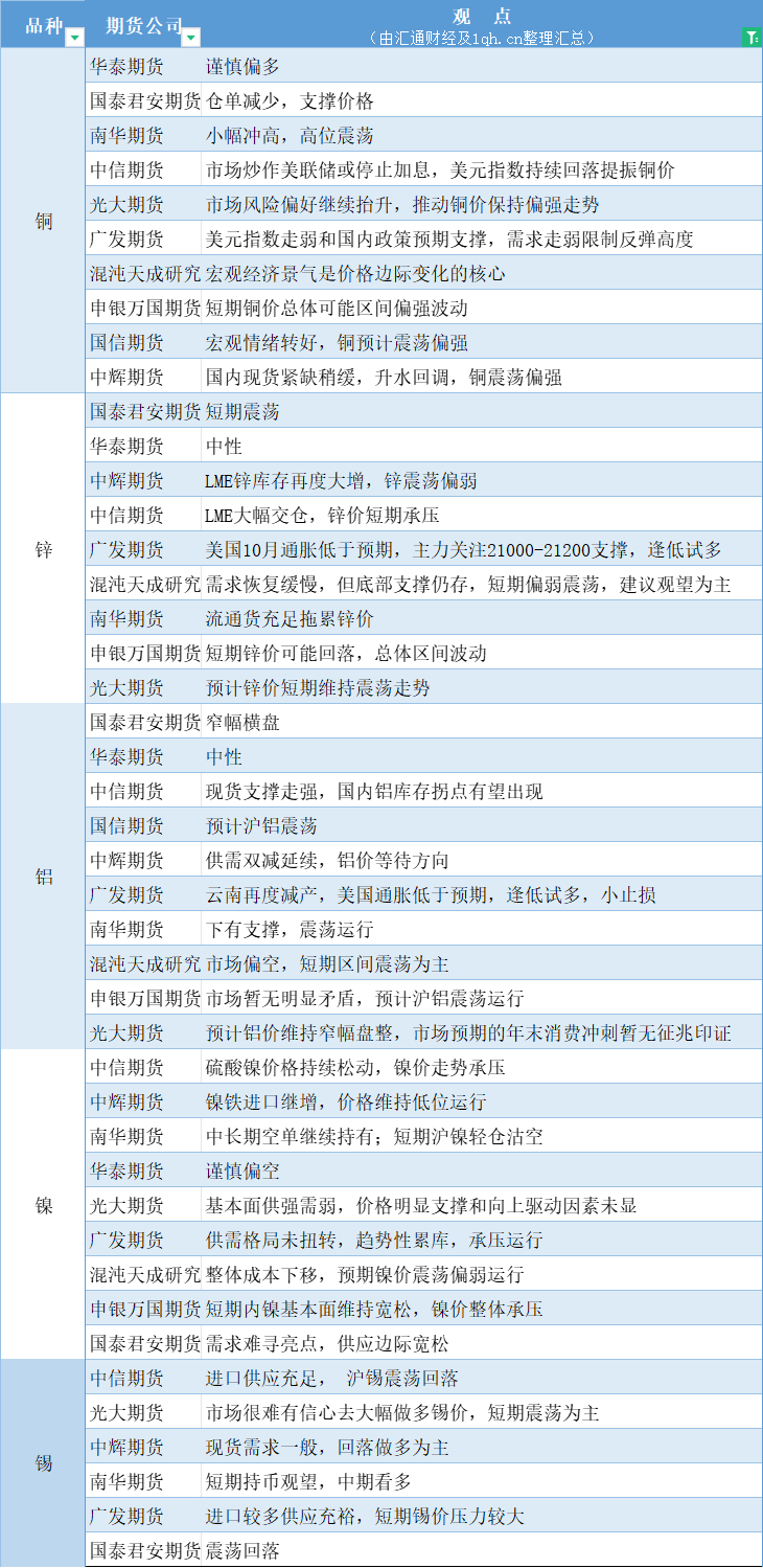汇通财经APP讯——期货公司观点汇总一张图:11月22日有色系(铜、锌、铝、镍、锡等)