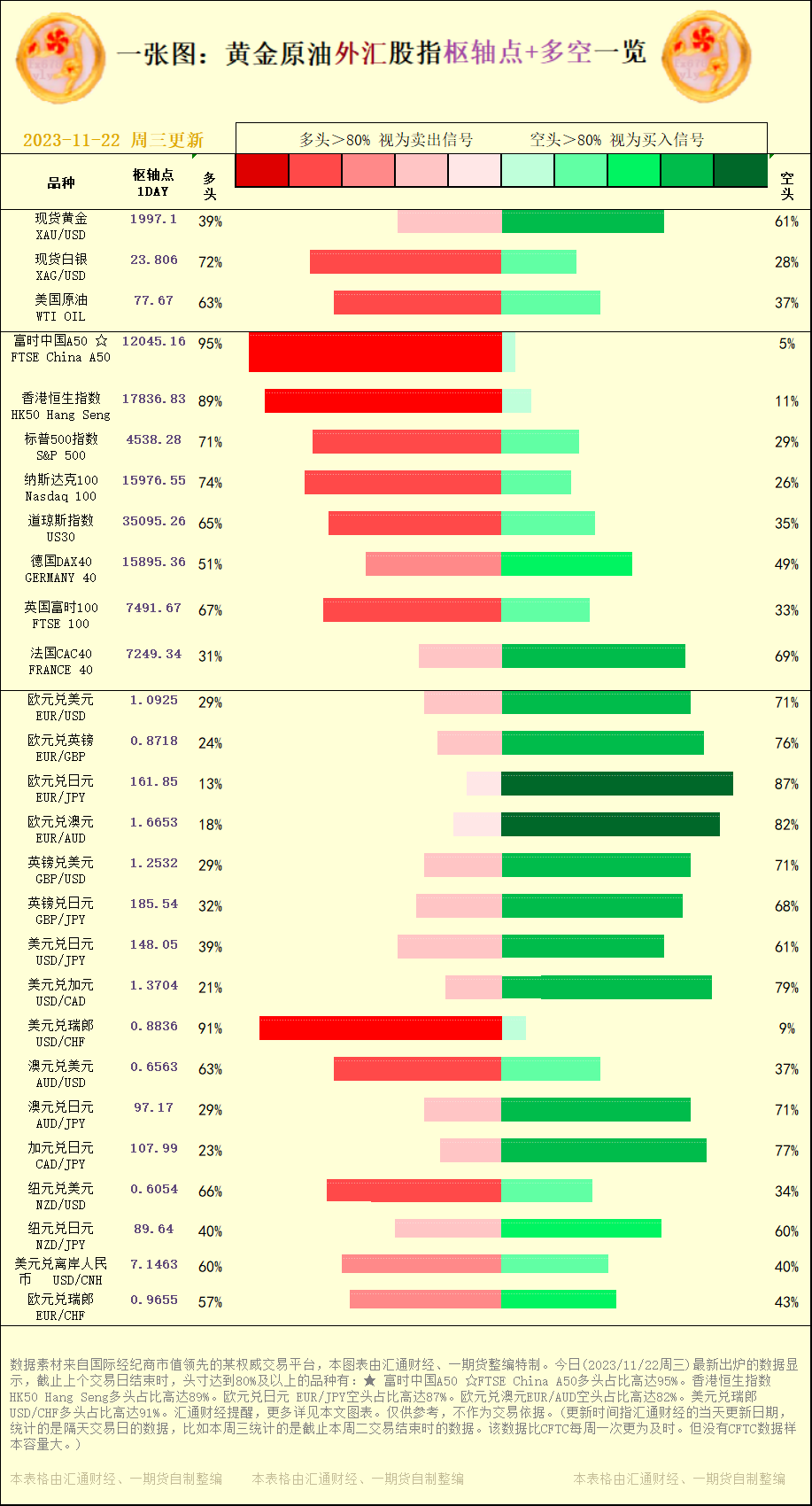 标题:一张图:2023/11/22黄金原油外汇股指"枢纽点+多空占比"一览