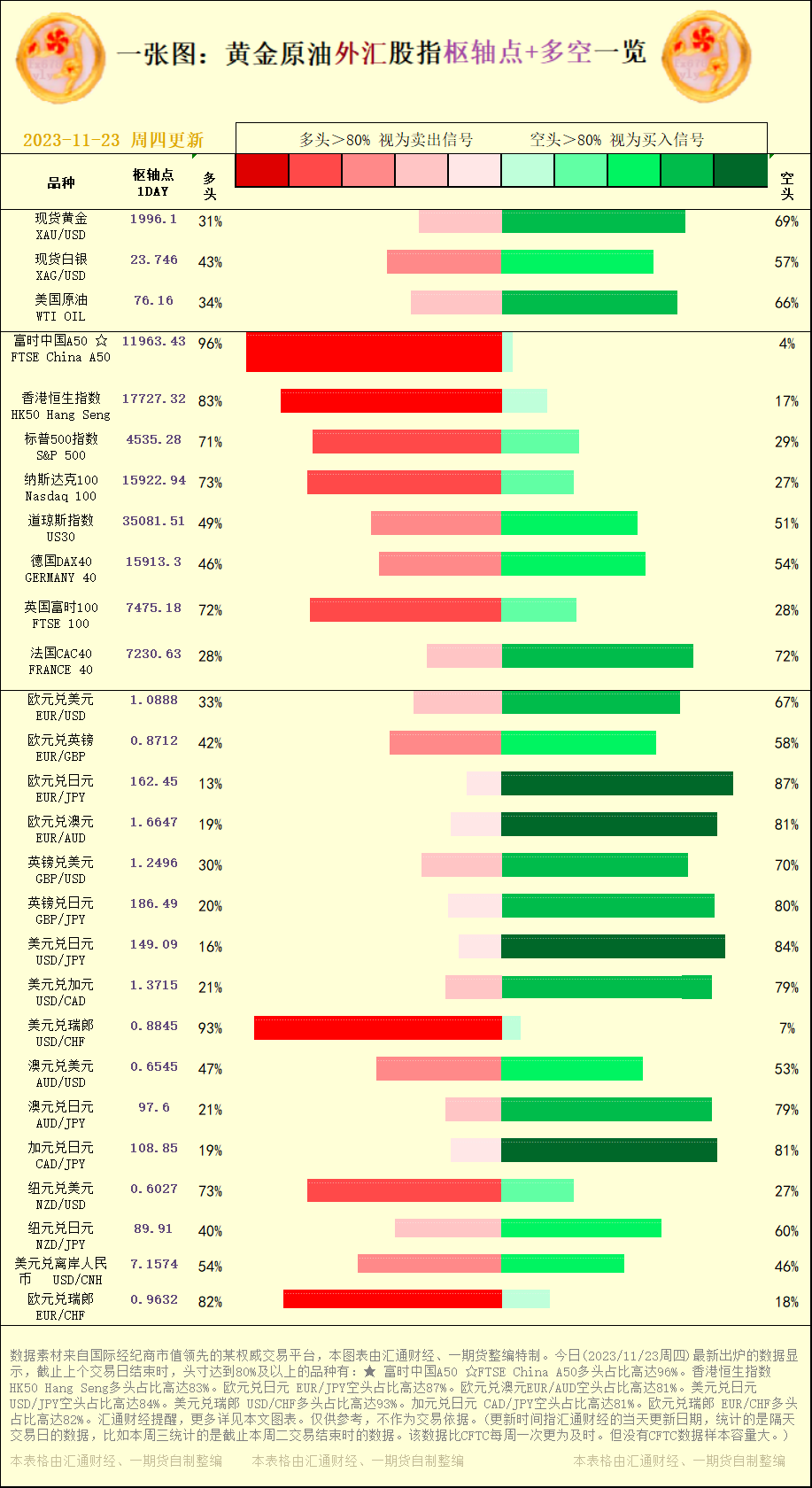标题:一张图:2023/11/23黄金原油外汇股指"枢纽点+多空占比"一览