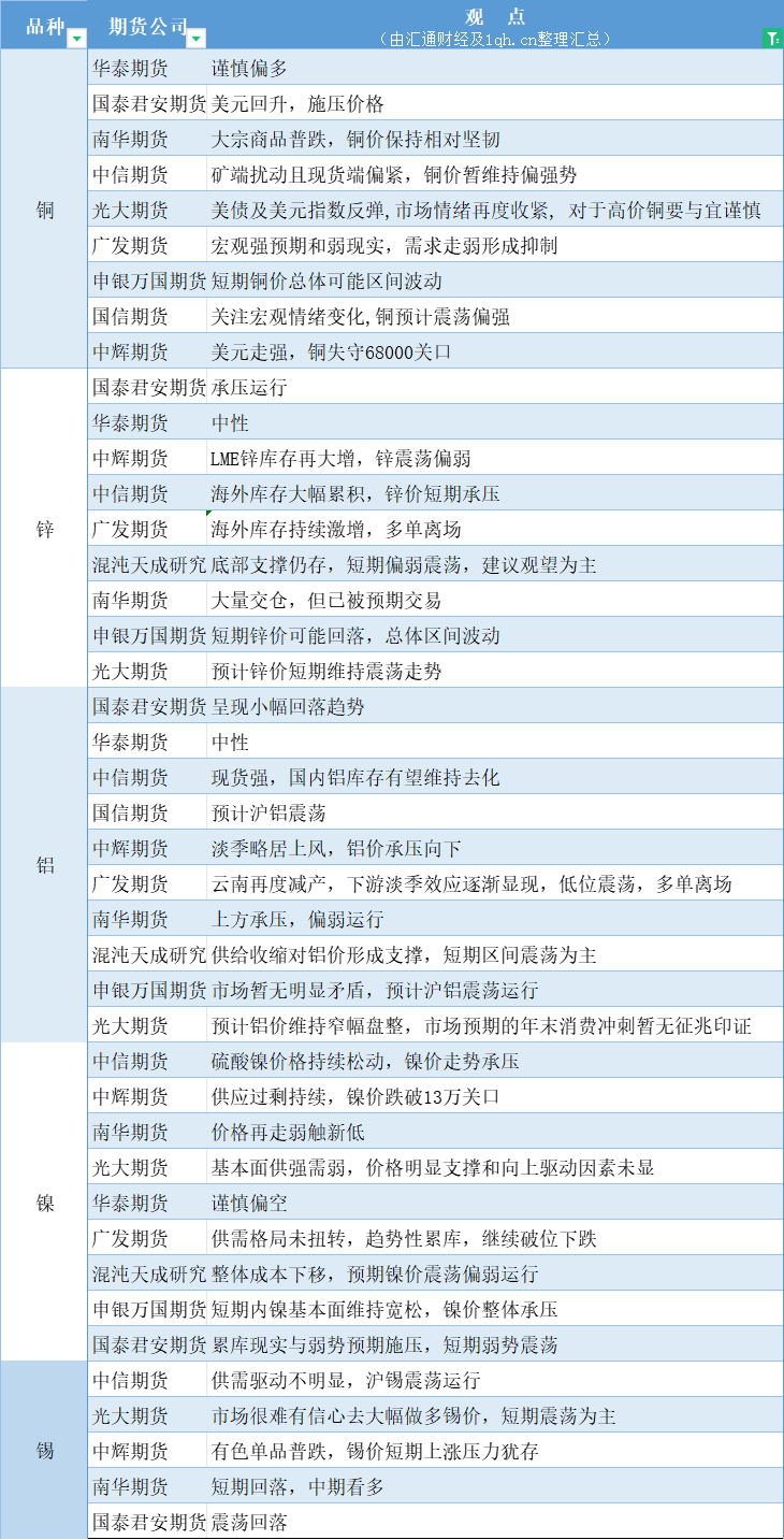 汇通财经APP讯——期货公司观点汇总一张图:11月23日有色系(铜、锌、铝、镍、锡等)
