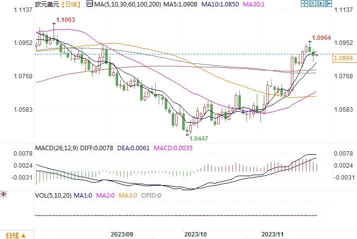 北京时间11月23日9:59 欧元兑美元 报 1.0894/95。