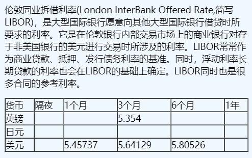 伦敦同业拆借利率(London InterBank Offered Rate,简写LIBOR),是大型国际银行愿意向其他大型国际银行借贷时所要求的利率。它是在伦敦银行内部交易市场上的商业银行对存于非美国银行的美元进行交易时所涉及的利率。LIBOR常常作为商业贷款、抵押、发行债务利率的基准。同时,浮动利率长期贷款的利率也会在LIBOR的基础上确定。LIBOR同时也是很多合同的参考利率。