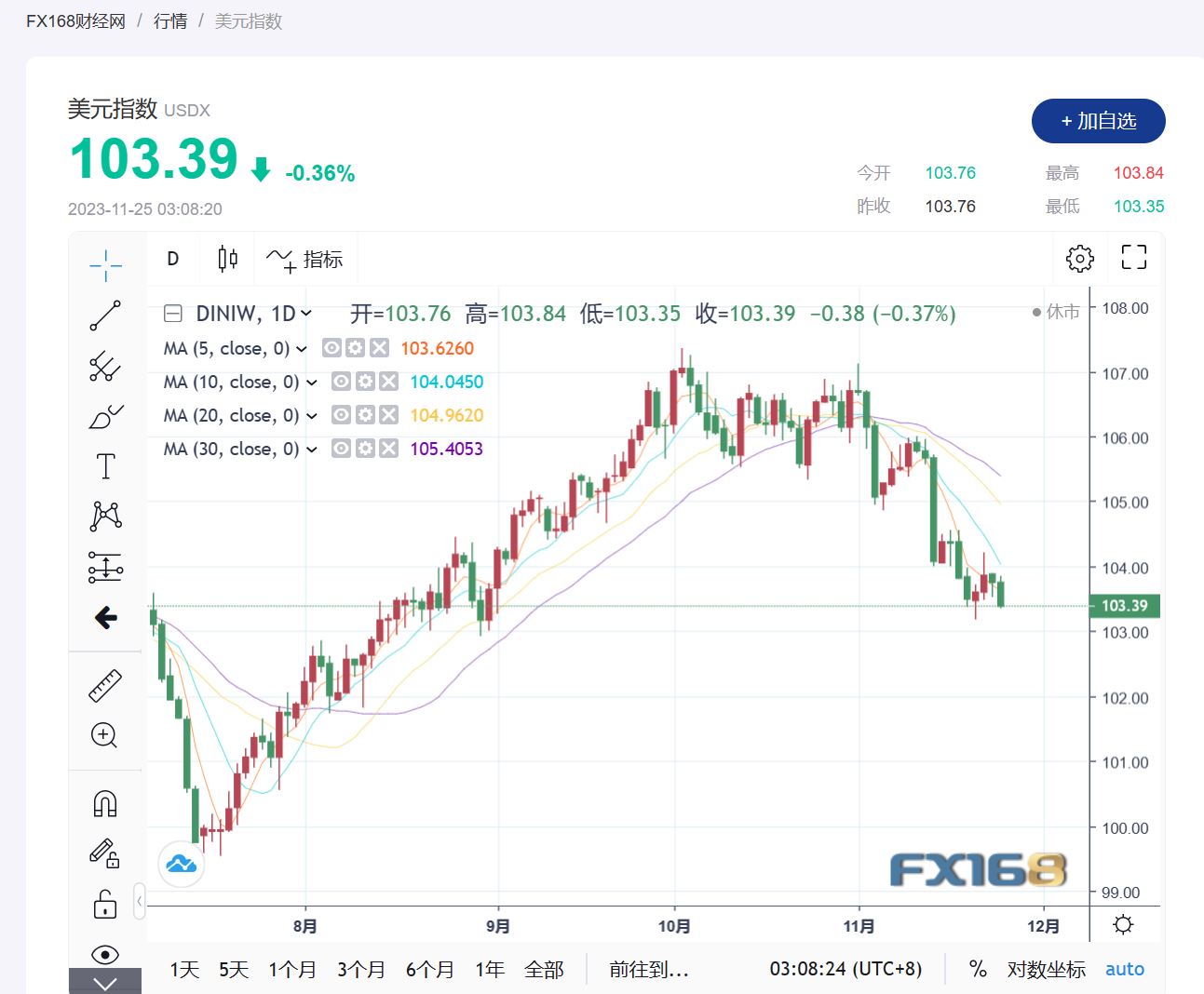 美元指数在两月内最低水平徘徊,现报103.39,跌幅0.36%,有可能是本月连续第二周下跌。
