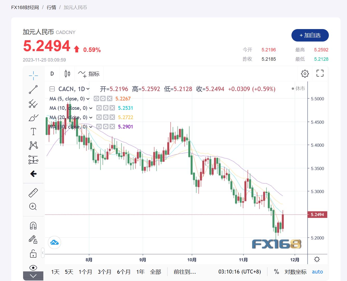 周五(11月24日)随着美国制造业疲软、市场下调美联储降息预期,美元面临进一步下行。好于预期的零售销售报告和市场风险情绪的广泛复苏正在提振加元,使加元兑主要货币上涨。加元/人民币收货最近三周最高涨幅。