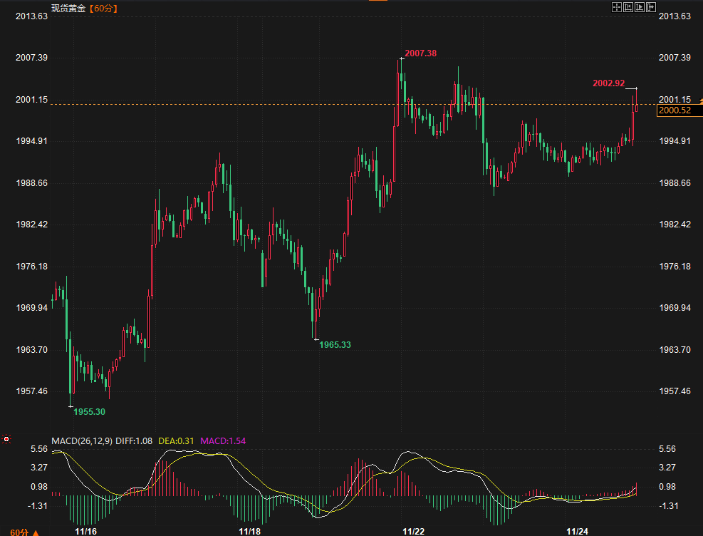 汇通财经APP讯——周五(11月24日)美市早盘,由于美元指数走弱也对金属有利,金价突破2,000美元。然而,原油价格疲软和美国国债收益率上升是限制金价上涨空间的外部市场利空因素。