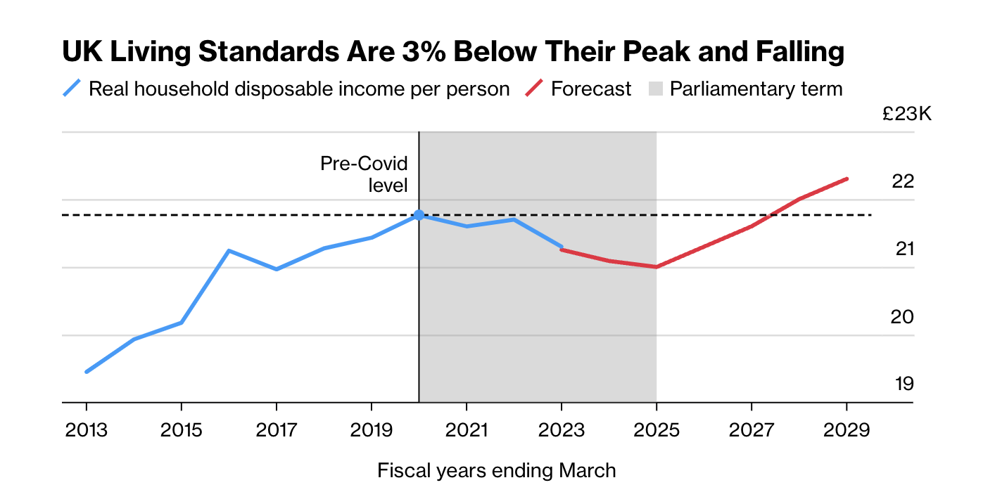 家庭一直感受到物价上涨和利率飙升带来的压力。尽管本周宣布了减税措施,但预计英国的生活水平在本届议会期间仍将下降。