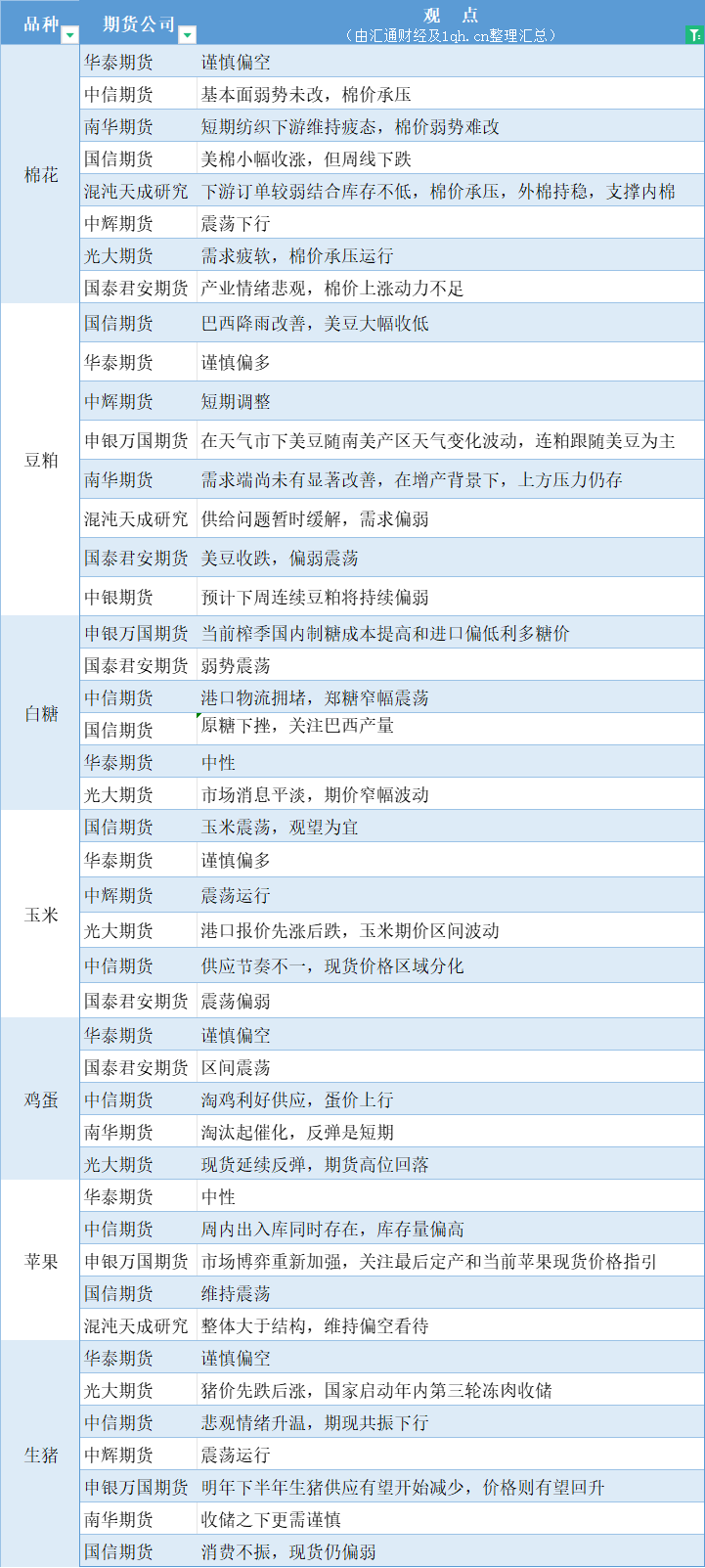 汇通财经APP讯——期货公司观点汇总一张图:11月27日农产品(棉花、豆粕、白糖、玉米、鸡蛋、生猪等)