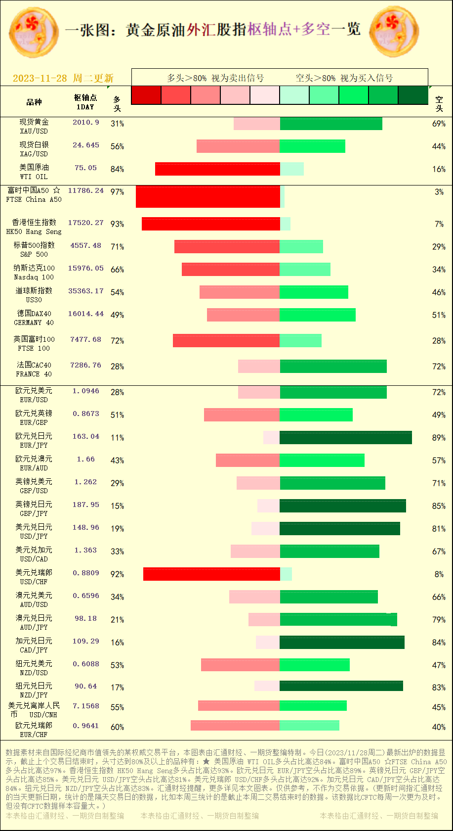 标题:一张图:2023/11/28黄金原油外汇股指"枢纽点+多空占比"一览