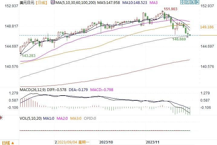 周三(11月29日),美元兑日元一度触及两个多月最低的146.65,尾盘下跌0.09%,收盘在147.30。周三来自美国的数据显示,第三季美国国内生产总值(GDP)环比增长年率修正后为5.2%,前值为4.9%。美国商务部在对第三季GDP的二次估值中称,这是2021年第四季度以来最快的扩张速度。虽然数据略使美元指数反弹,但幅度有限,而且基本也未影响到日元近期的升势。这主要是市场上对于美联储明年将降息的押注丝毫未减,尤其是周二美联储理事沃勒发出明年有望降息的言论后,大大影响到美债和美元走软。对美债收益率极为敏感的日元借此是大幅回升。接下来还要继续留意美联储主席鲍威尔周五的发言。如果他给出与沃勒相同的暗示,美元/日元将会受压延续跌势。但如果他高调倾向继续维持高利率并极力澄清市场对于沃勒讲话的误解,美元兑日元短线或会形成空头回补的调整走势。日线图上观察,美元/日元整体仍处在继续走低的局面。