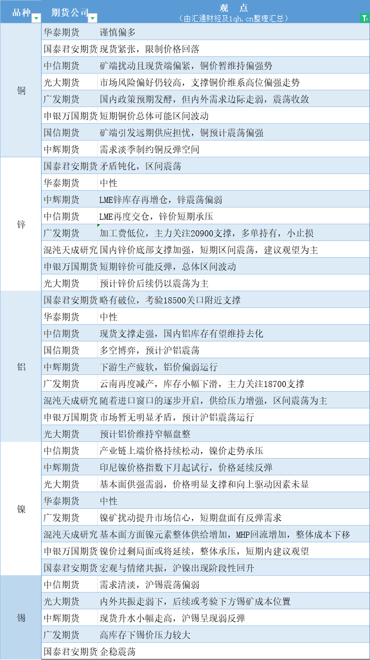 汇通财经APP讯——期货公司观点汇总一张图:11月30日有色系(铜、锌、铝、镍、锡等)