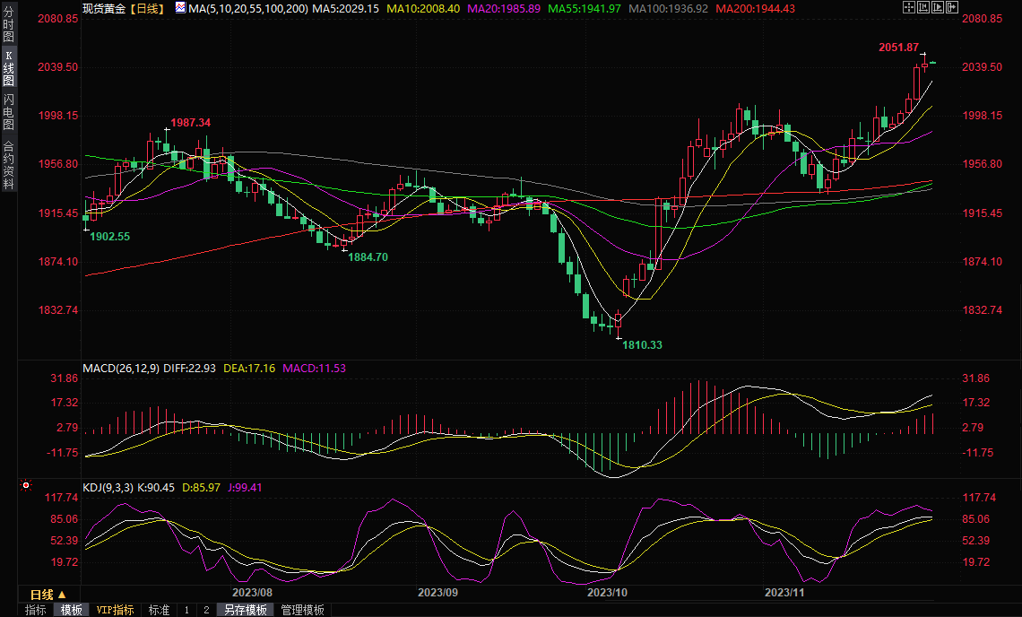 现货黄金周三收涨0.13%,收报2043.90美元/盎司。