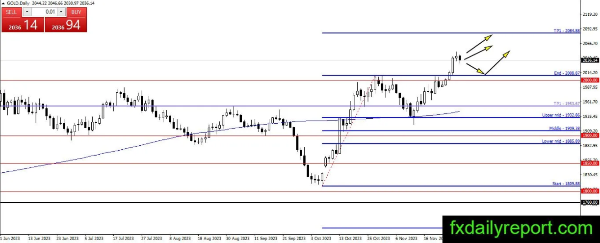 黄金价格继续看涨趋势,但今天似乎已反转下行。如果这种看跌走势能够持续下去,那么2000美元就是交易者可以关注的下行目标。当支撑点附近出现看涨反应时,就是交易者建立多头头寸的机会。