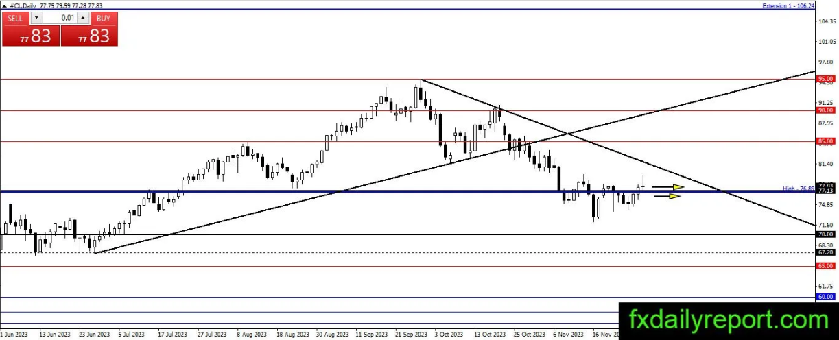今天原油价格正在尝试延续其上涨趋势。然而,价格的上涨动力似乎在减弱,目前交易价格在开盘点位附近。看来77.13美元附近的盘整还将继续,交易者只能等待进一步确认。
