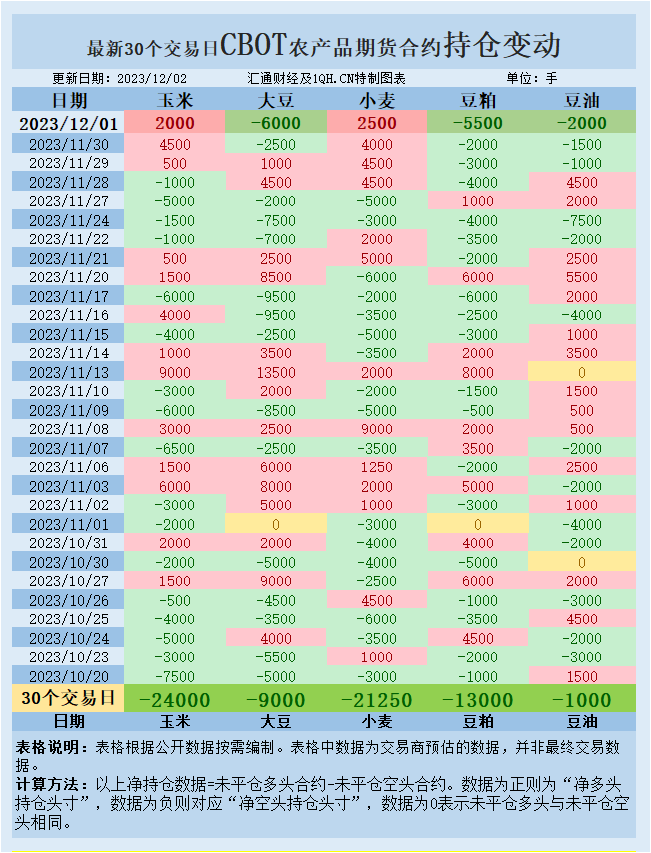 交易商估算的结果显示,大宗商品基金本周五(12月01日)增加大豆、豆油、豆粕投机性净空头头寸,增加玉米、小麦投机性净多头头寸。本周,大宗商品基金增加小麦投机性净多头头寸,增加、玉米、豆油、豆粕、大豆投机性净空头头寸。