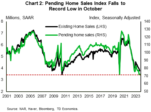 月度个人收入和支出报告在通货膨胀方面也带来了一些好消息。亮点是核心PCE(美联储首选的通胀指标)继续减速,10月份同比增速从上月的3.7%降至3.5%(图1)。随着美联储向2%目标的持续推进,利率有所下降,抵押贷款利率也是如此。30年期抵押贷款利率目前徘徊在7.2%附近,比10月中旬8%的峰值低了约80个基点。这种回落似乎为住房市场提供了一些缓解,上周抵押贷款购买申请连续第四周上升。但是,利率的影响往往是滞后的,所以这需要一段时间才能在销售活动中体现出来。为此,10月份待售房屋销售降至历史最低点,表明情况在好转之前可能会变得更糟(图2)。