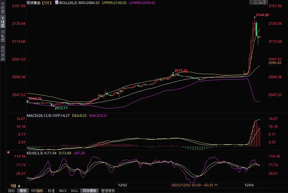 汇通财经APP讯——周一(12月4日)亚市早盘,现货黄金继续飙升,短线一度拉升约70美元,刷新历史高点至2144.68美元/盎司,涨幅约3.54%,延续了上周五涨势,上周五金价上涨1.74%,正好涨至历史高点附近。一方面,在临时停火协议破裂后,以色列军队袭击了加沙地带,令市场对中东战火进一步蔓延的担忧情绪急速升温,给金价提供避险支撑。另一方面,上周五美联储主席鲍威尔讲话偏向鸽派,提升了市场对美联储明年上半年的降息预期,也给金价提供上涨动能。