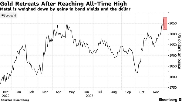周一(12月4日),随着美元和美国国债收益率走高,金价从创纪录高位回落。美国彭博社分析称,有迹象表明,交易员对美联储降息的激进预期可能走得太远,这推动美元反弹。