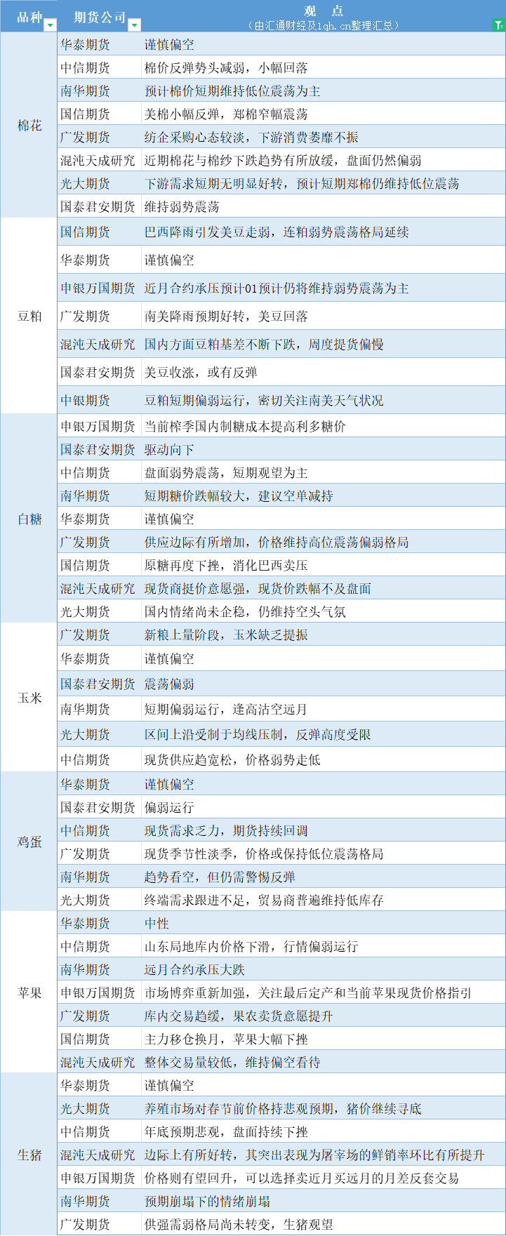 汇通财经APP讯——期货公司观点汇总一张图:12月6日农产品(棉花、豆粕、白糖、玉米、鸡蛋、生猪等)