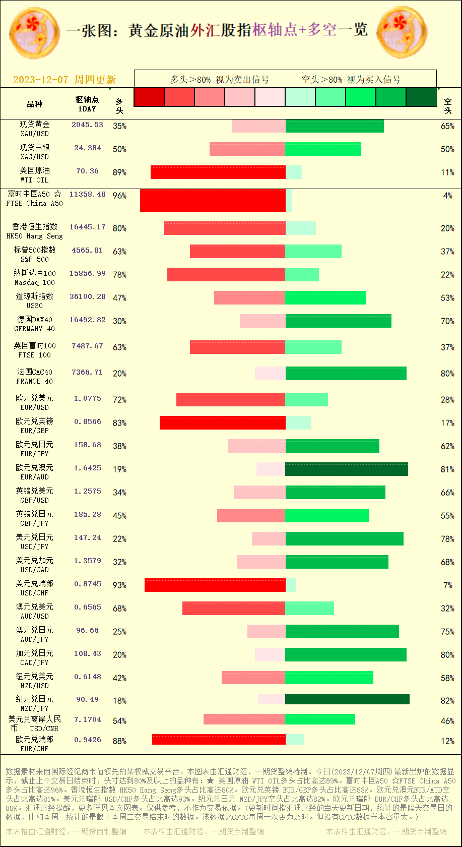 标题:一张图:2023/12/07黄金原油外汇股指"枢纽点+多空占比"一览