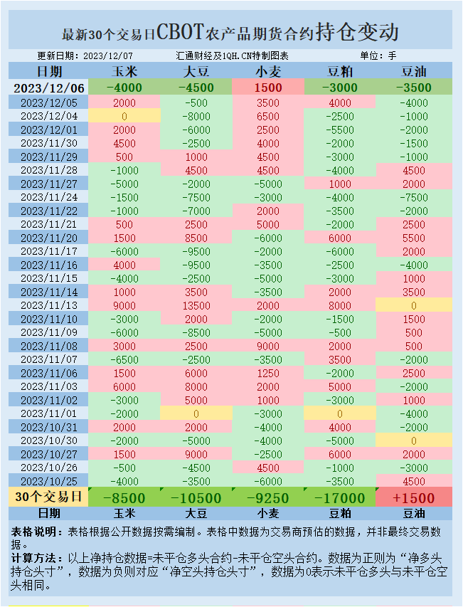 表格中数据为交易商预估的数据,并非最终交易数据。 计算方法:以上净持仓数据=未平仓多头合约-未平仓空头合约,即数据为正则为“净多头持仓头寸”,数据为负则对应“净空头持仓头寸”,0则表示未平仓多头与未平仓空头相同。
