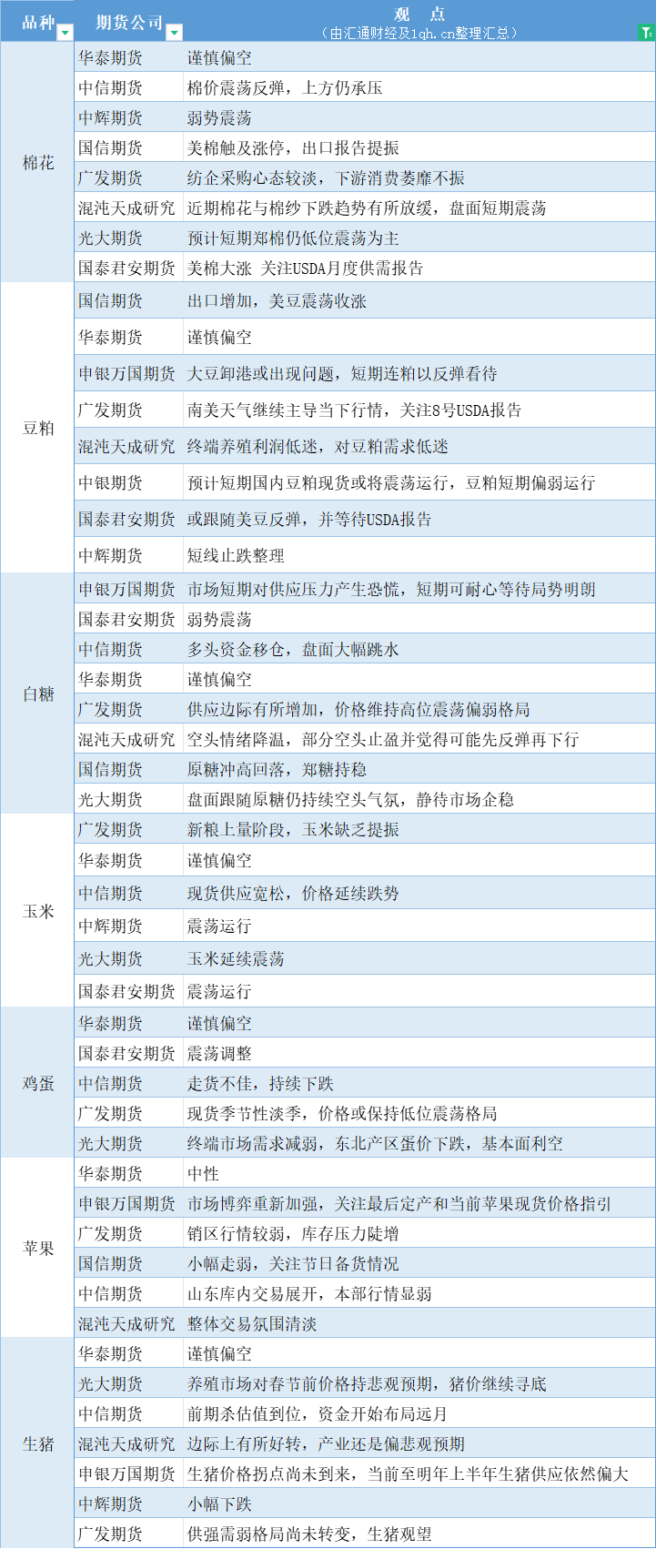 汇通财经APP讯——期货公司观点汇总一张图:12月8日农产品(棉花、豆粕、白糖、玉米、鸡蛋、生猪等)