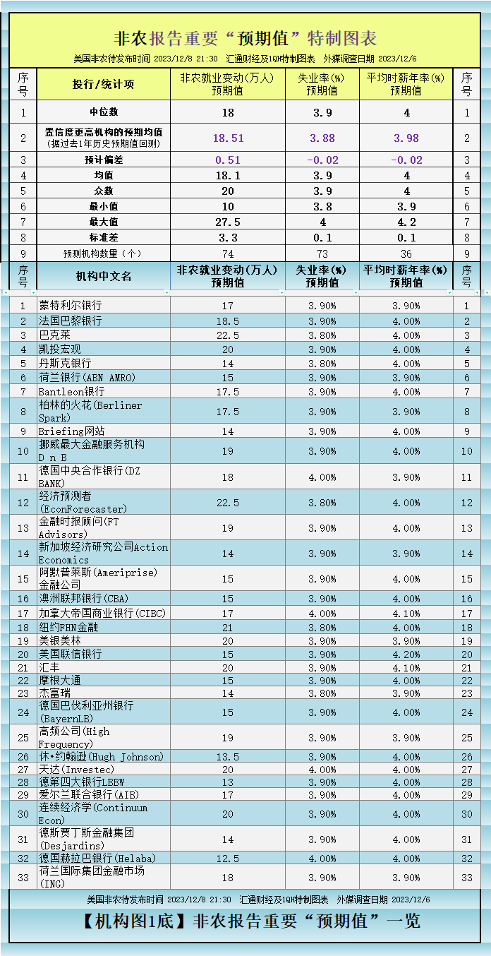 汇通财经APP讯——周五(2023/12/8 21:30)将发布备受关注的美国非农就业报告。据权威外媒调查全球逾70个国际知名投行/金融大结果来看,11月非农就业变动的预期中值(中位数)为:增加18万,失业率预期中值:3.9%,平均时薪(平均每小时工资)年率预期中值:4%。