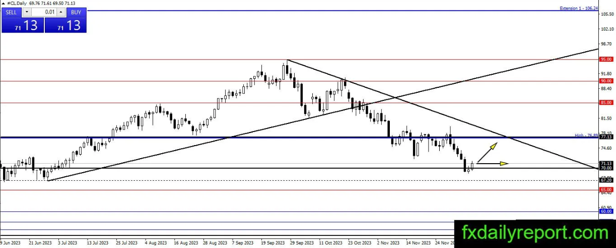 原油价格一路经历了从77.13美元下跌到70.00美元的阶段性减弱,目前显示出一种看涨的反应,并将尝试从70.00美元的水平反弹。如果价格能够收于77.13美元上方,那么情况可能会转为看涨。在一段时间内,价格有可能在70.00美元附近继续盘整。