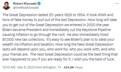 他上周也指出,美国经济软着陆是一个幻想,迫降的可能性更大。他解释说:“我在《2012 年富爸爸预言酒吧》一书中警告过这次巨大的崩溃,下一次崩溃可能会演变成大萧条。2024 年是选举年,请投票给保守派,而不是像拜登。”