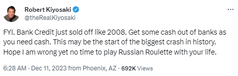 “银行信贷就像2008年一样被抛售,因为你需要现金,所以从银行取出一些现金。这可能是历史上最大崩盘的开始,希望我是错的,但没有时间用你的生命来玩俄罗斯轮盘,”清崎写道。
