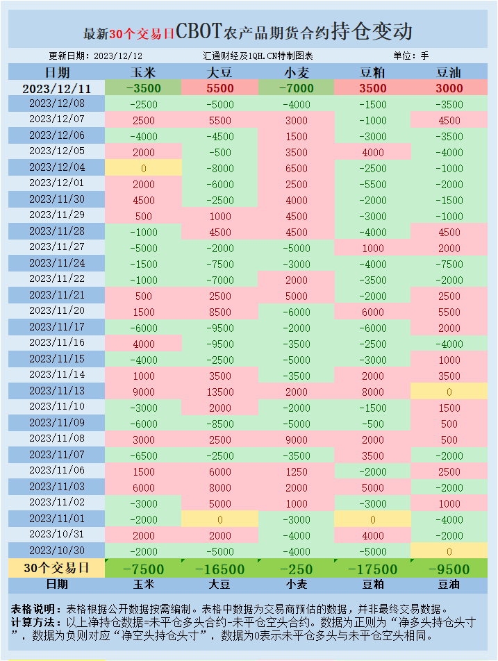 交易商估算的结果显示,大宗商品基金本周一(12月11日)增加玉米、小麦投机性净空头头寸,增加大豆、豆油、豆粕投机性净多头头寸。最新30个交易日,大宗商品基金增加豆油、玉米、豆粕、大豆、小麦投机性净空头头寸。