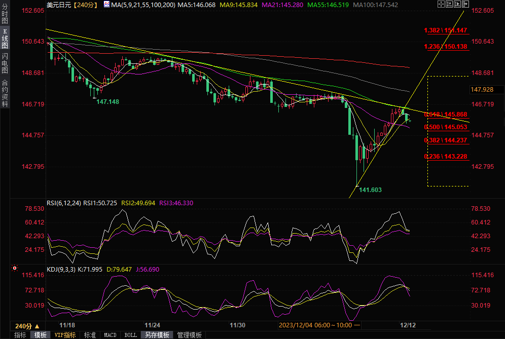 汇通财经APP讯——周二(12月12日),亚盘时段,美元/日元震荡下跌,盘中最低触及145.53,跌幅约0.42%,目前交投于145.72附近。美元/日元再次测试自11月中旬以来形成的下跌趋势线后转跌,后市可能会再度下探近期低点141.60附近支撑。
