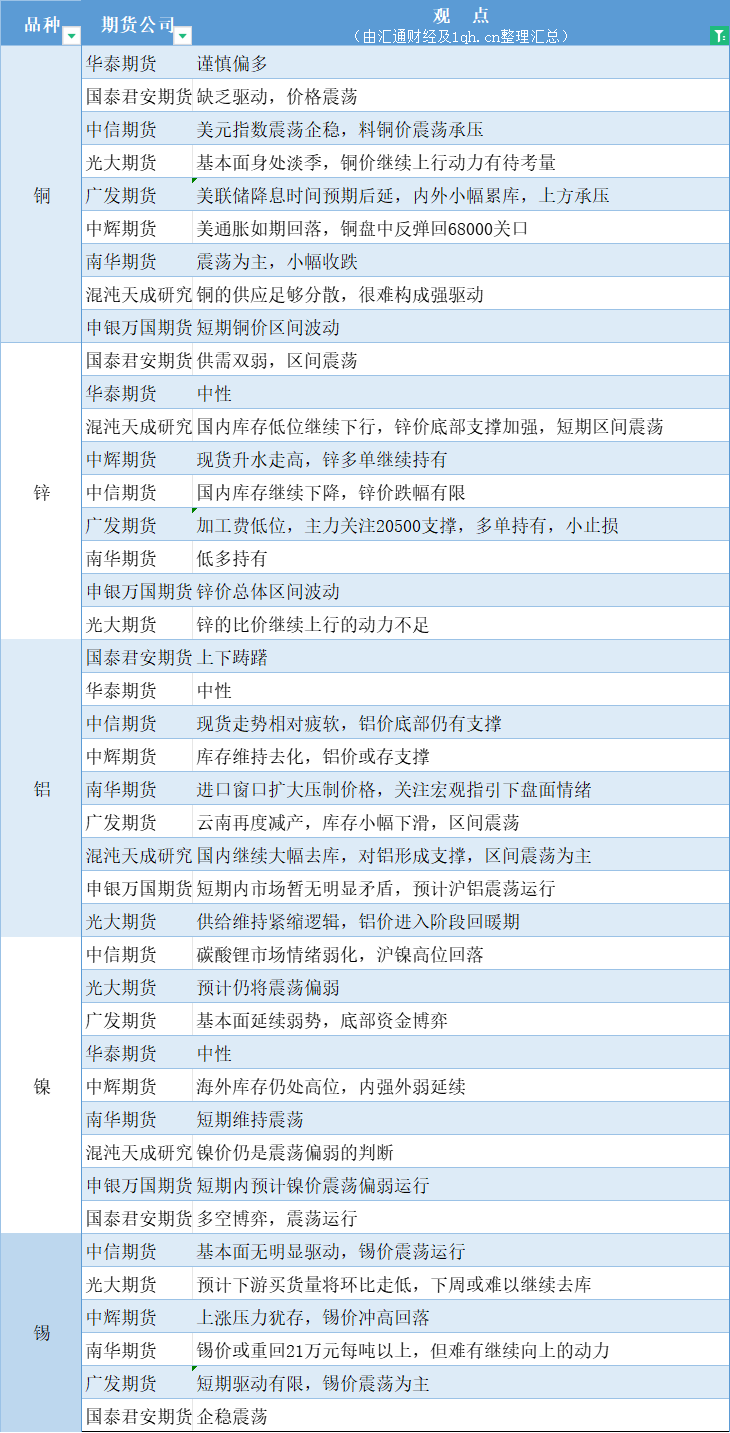 汇通财经APP讯——期货公司观点汇总一张图:12月13日有色系(铜、锌、铝、镍、锡等)