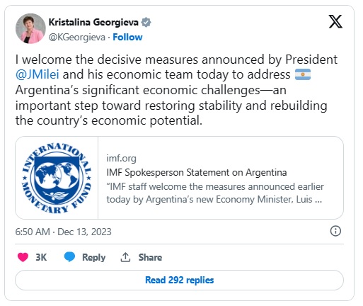 作为阿根廷新总统米莱(Javier Milei)为陷入困境的国家经济实施“休克疗法”的第一波措施,阿根廷将比索贬值54%,并宣布一系列削减开支的举措。