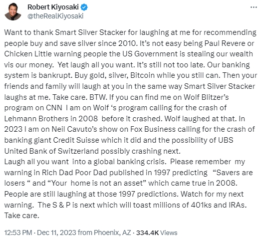 清崎在推特写道:“要感谢Smart Silver Stacker嘲笑我自2010年以来建议人们购买和保存白银,美国早期实业家Paul Revere或经典故事Chicken Little警告人们,美国政府正在用我们的钱窃取我们的财富,这并不容易。但你想笑就笑吧,现在还不算太晚。”