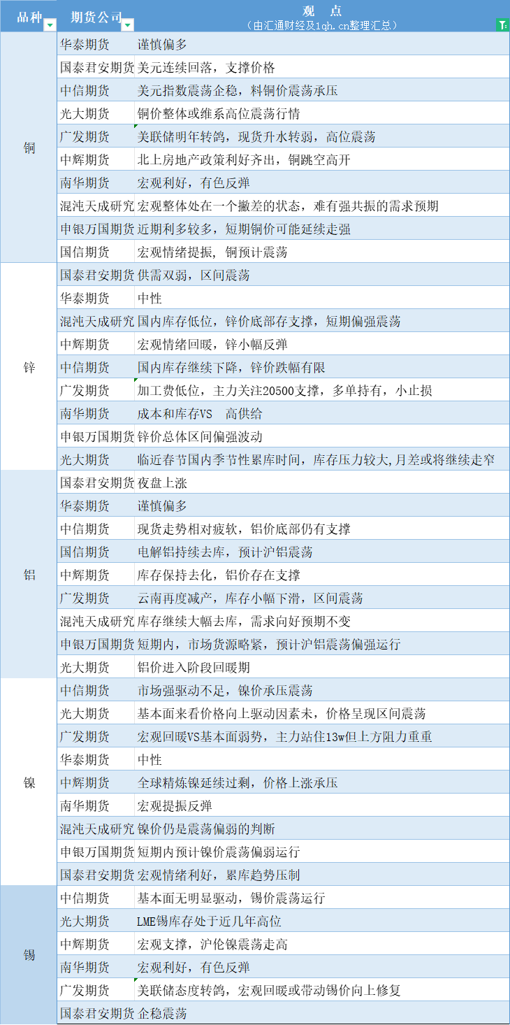 汇通财经APP讯——期货公司观点汇总一张图:12月15日有色系(铜、锌、铝、镍、锡等)