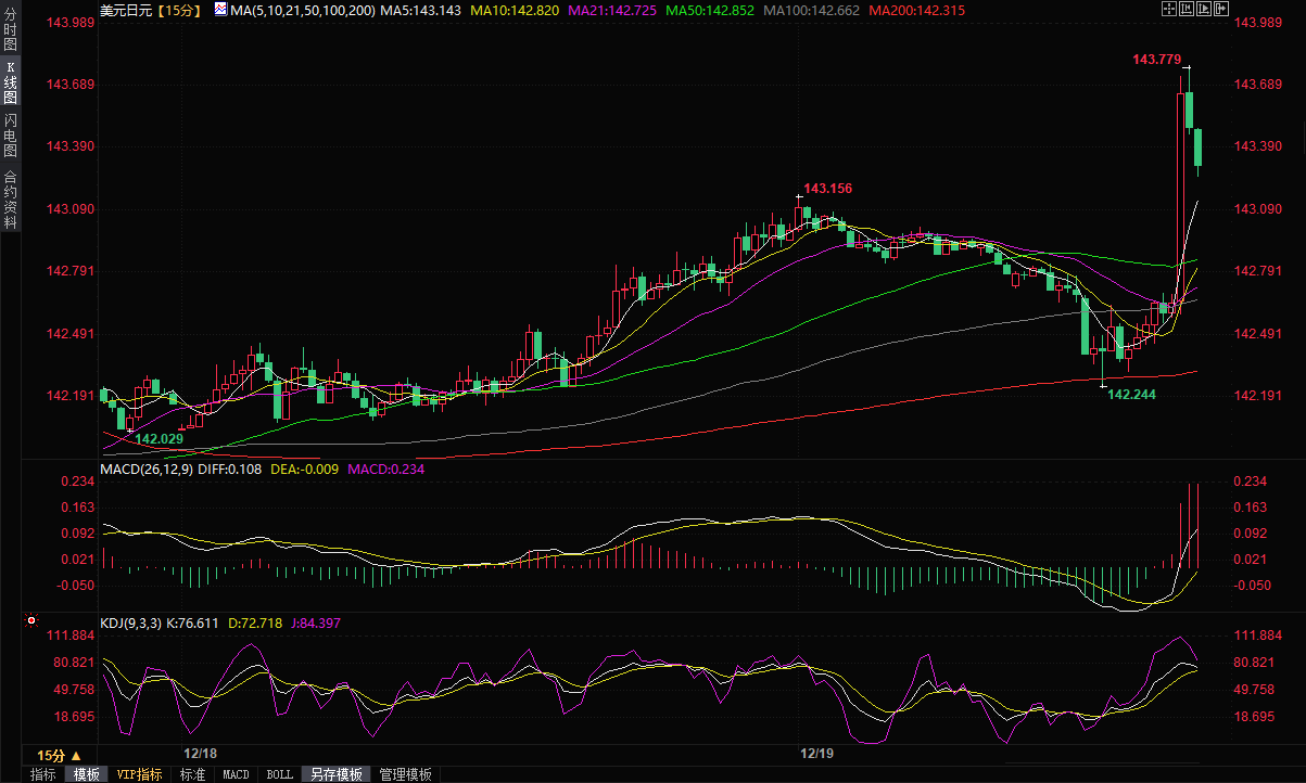 周二(12月19日)亚市,美元/日元短线走高逾100点,最高触及143.78。日本央行将基准利率维持在历史低点-0.1%,将10年期国债收益率目标维持在0%附近,符合市场预期,且未出现政策退出的“黑天鹅”迹象。
